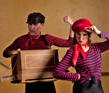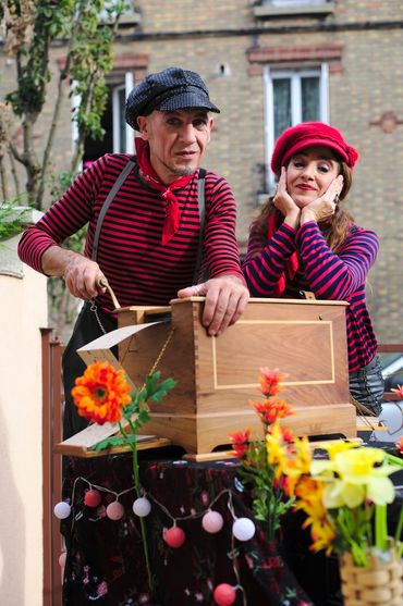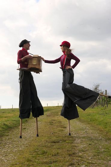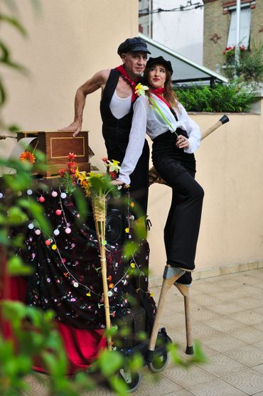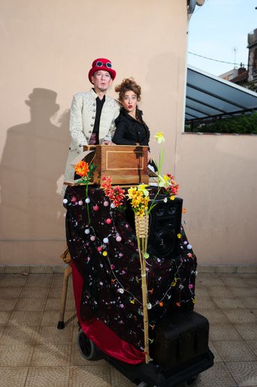 2 ou 3 personnages sur échasses avec un chariot son et un orgue de barbarie.